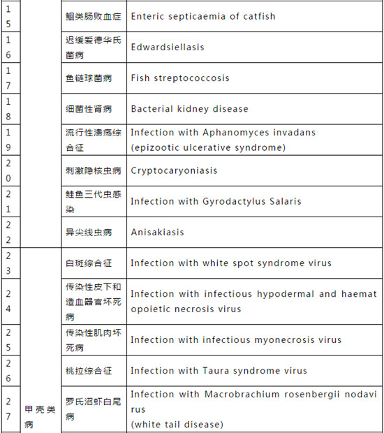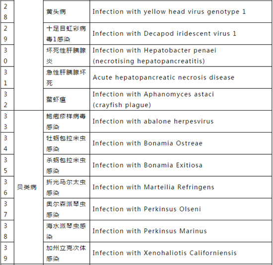 修订后的《名录》,包括水生动物疫病43种,均被列为二类进境疫病。新增了7种水生动物疫病,分别为:鲑鱼甲病毒感染、鲤浮肿病毒病、罗非鱼湖病毒病、细菌性肾病、急性肝胰腺坏死、十足目虹彩病毒1感染(虾虹彩病毒病)和蝾螈弧菌感染;删除了8种水生动物疫病,分别为:对虾杆状病毒病、斑节对虾杆状病毒病、小瓜虫病、黏孢子虫病、 指环虫病、河蟹颤抖病 、鲍脓疱病和鳖腮腺炎病。
