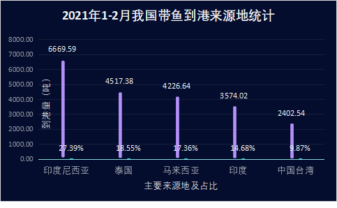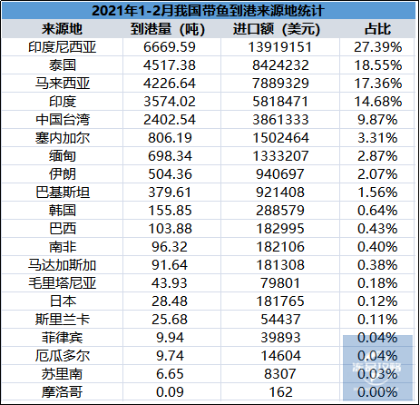 1-2月份带鱼进口来源地20个,前三个来源地分别是: