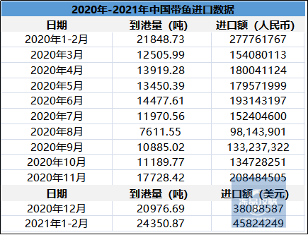 2021年1-2月份中国带鱼到港总量2.4万吨,货值金额4582.42万美元;同比2020年1-2月份到港量(2.2万吨)增加2502.14吨,增幅11.5%。