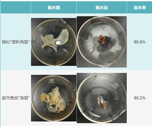 工作人员从大型超市购买了一份在售的海蜇,通过水分含量检测、燃烧实验和蛋白质含量检测等多个角度,与消费者提供的疑似“塑料海蜇”进行对比。